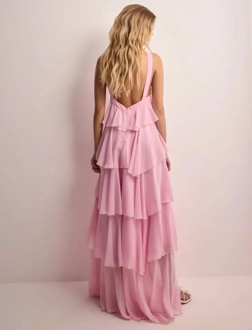 Entrez dans l'élégance avec la robe maxi dos nu Amira, un mélange à couper le souffle de romantisme et de sophistication. Avec ses détails floraux délicats et ses couches de volants en cascade, cette robe crée une silhouette gracieuse et accrocheuse, parfaite pour toute occasion.