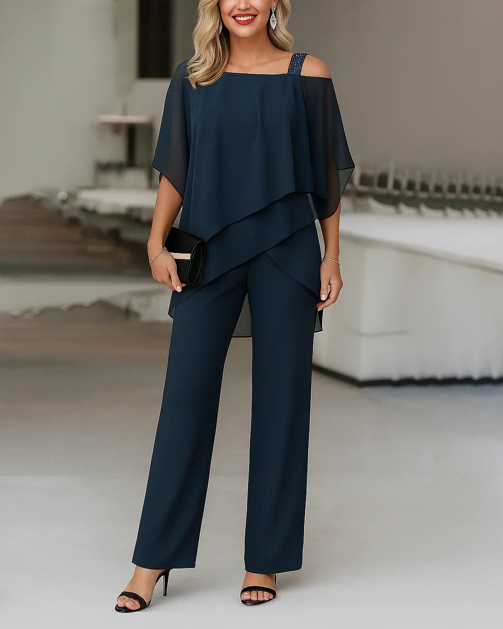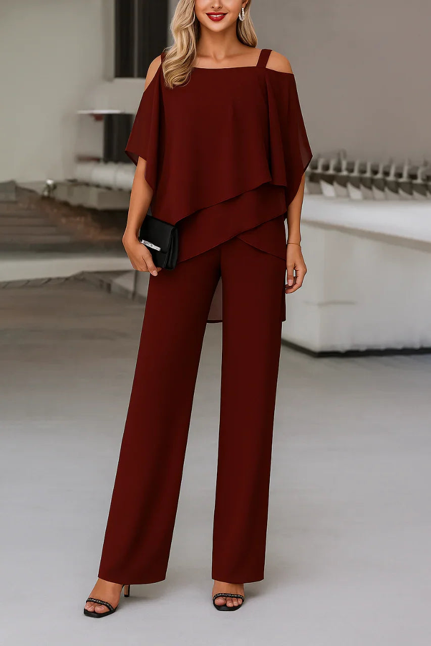 Adoptez un style raffiné avec cet ensemble à deux pièces à épaules dénudées, alliant élégance et confort. Le haut léger présente des volants subtils et un décolleté bateau fluide, tandis que le pantalon large offre une coupe ajustée et allongeante.