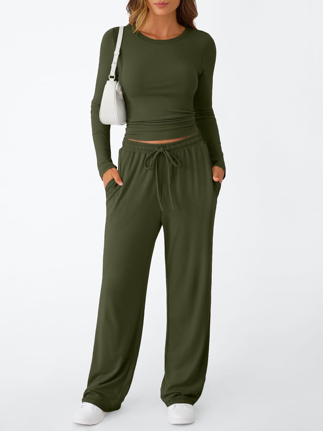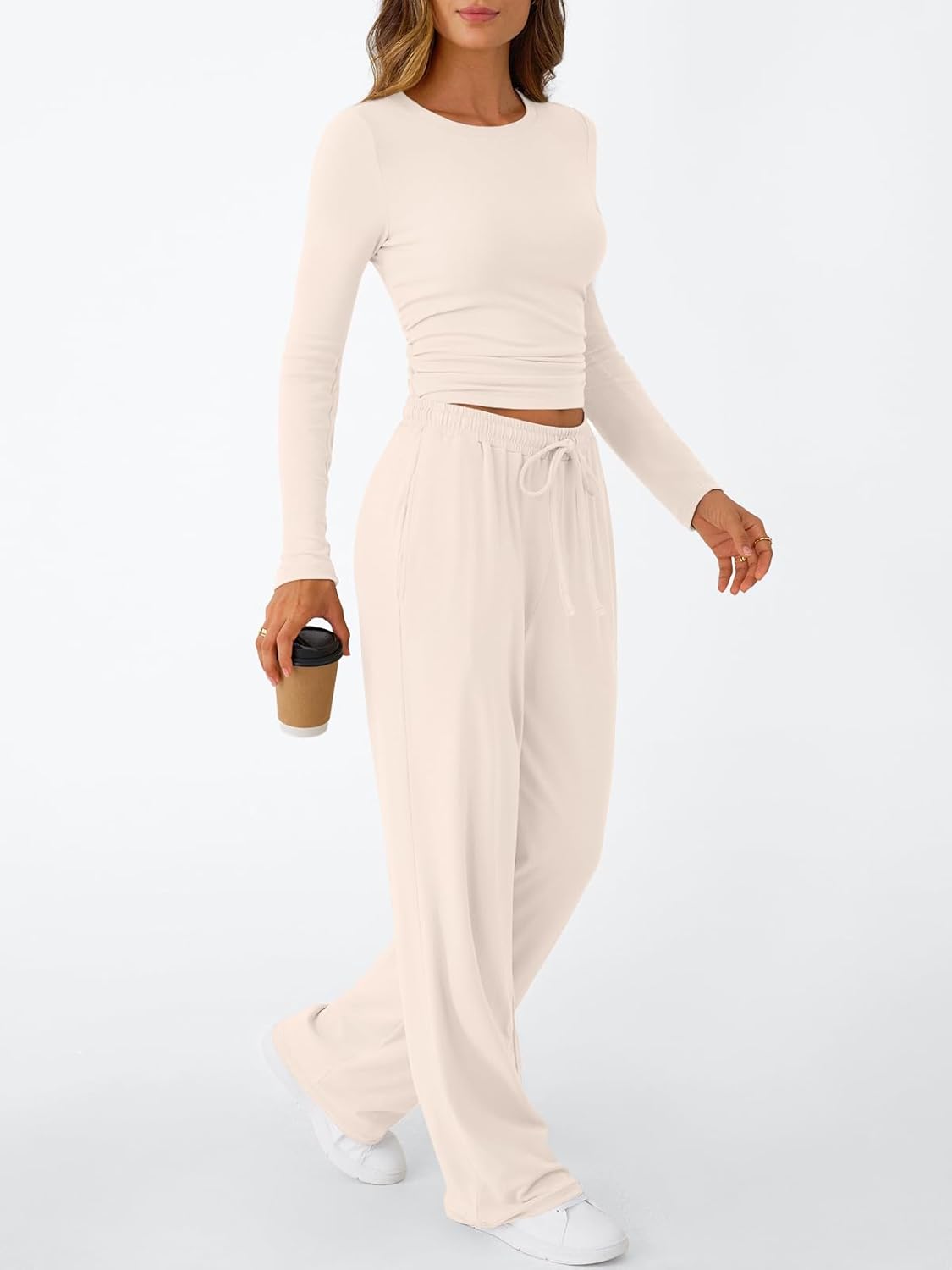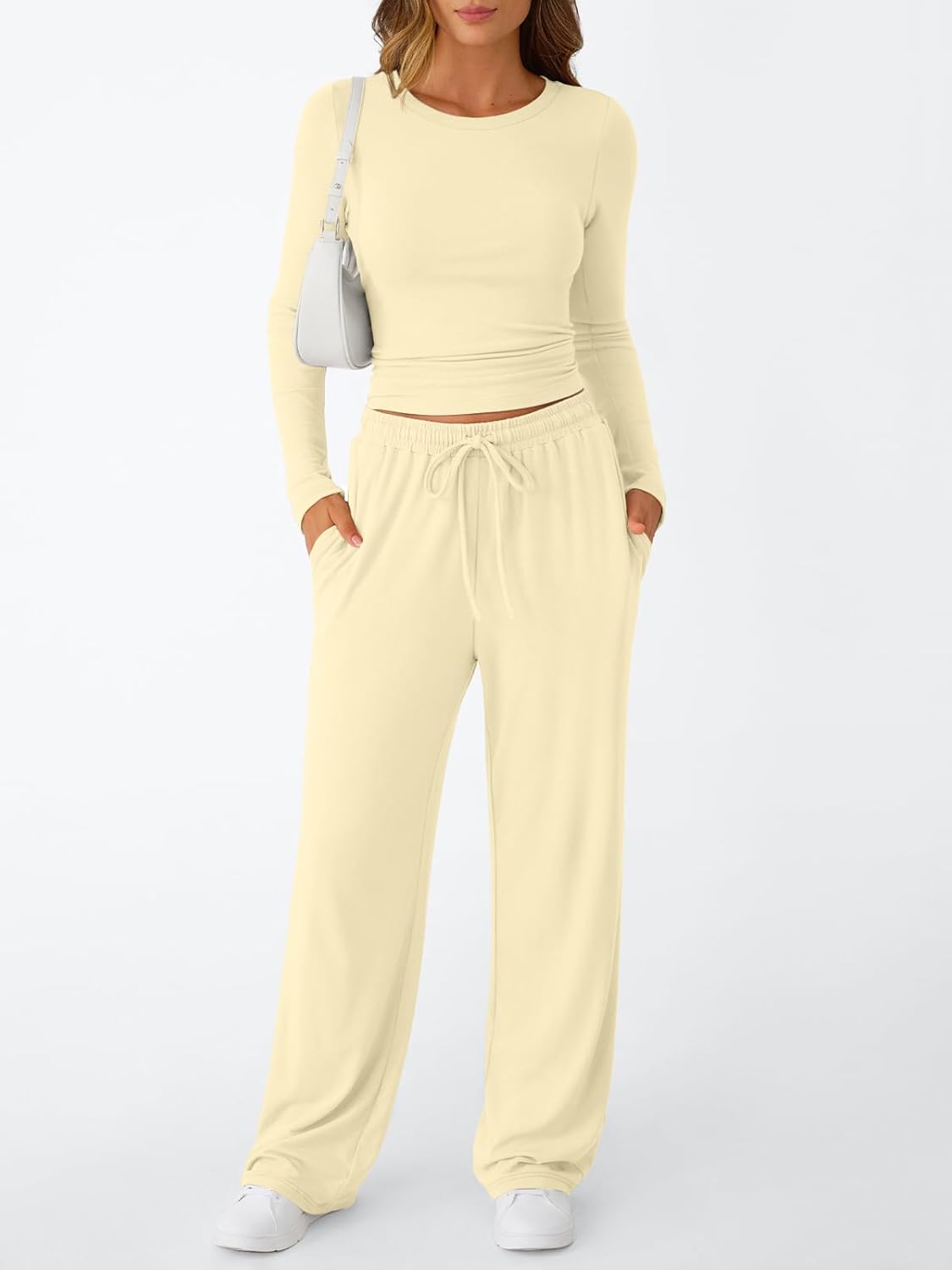 Design & Style : Avec un crop top élégant et un pantalon à jambe large, cet ensemble est conçu pour ceux qui aiment un mélange de style et de détente. Le ruching sur les côtés ajoute une touche d'élégance, tandis que la taille élastique des pantalons garantit un ajustement confortable qui bouge avec vous.