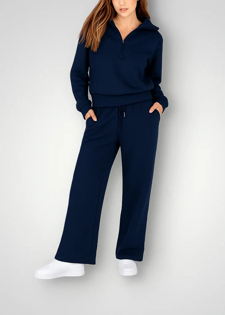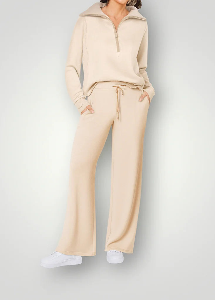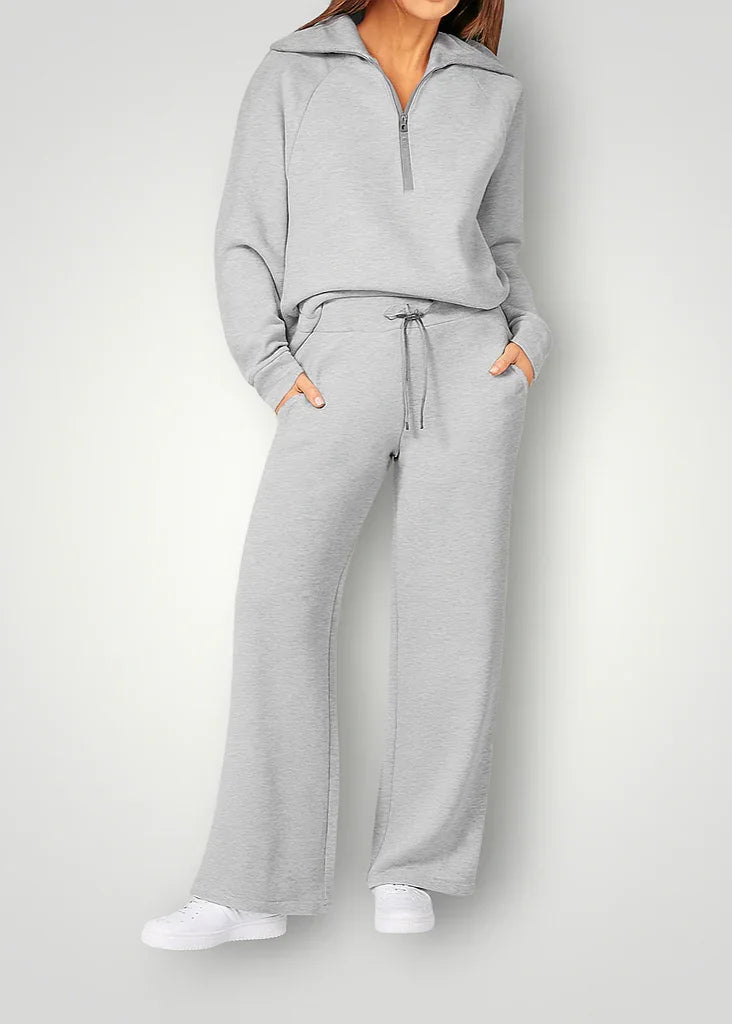 Restez confortable et élégante avec notre ensemble polyvalent de deux pièces, parfait pour vos journées décontractées et sorties informelles. Composé d'un haut zippé et d'un pantalon ample avec cordon de serrage, cet ensemble allie élégance décontractée et fonctionnalité quotidienne.