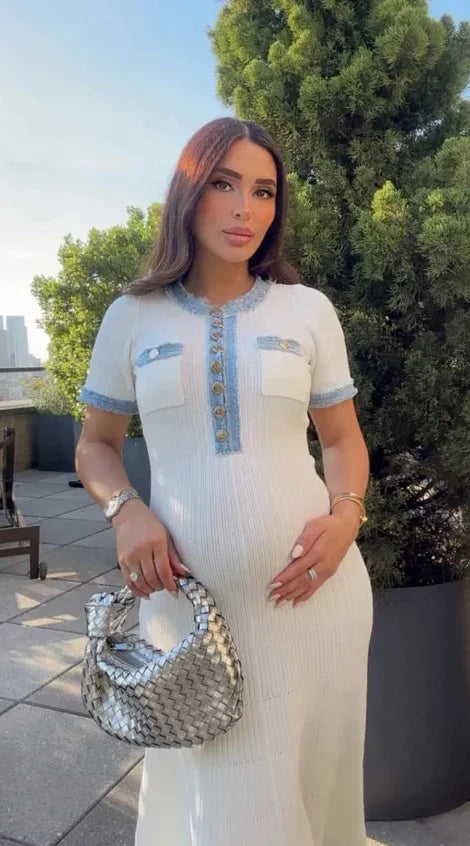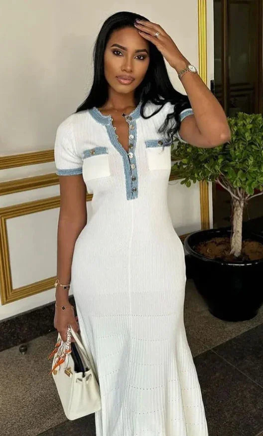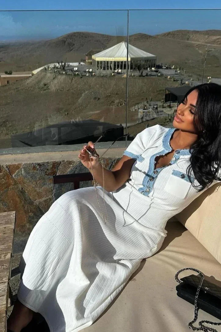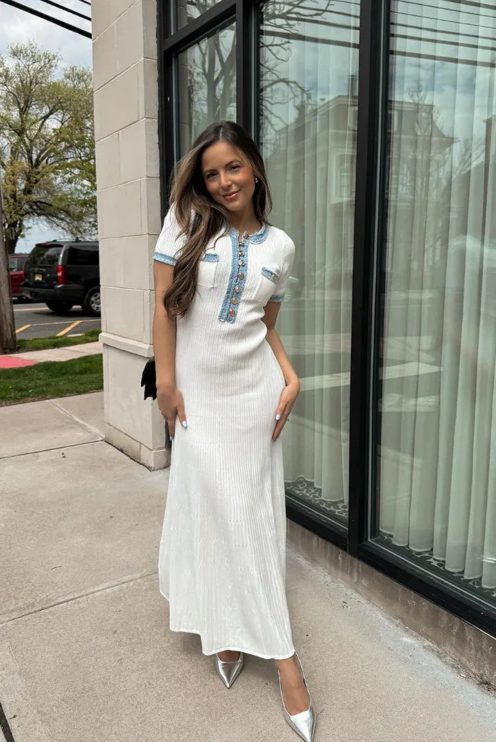 Élevez votre garde-robe avec la robe maxi boutonnée Jocelyn, alliant sophistication et charme moderne. Conçue en tricot bleu et blanc, elle se distingue par ses boutons dorés élégants et ses plis délicats pour un look intemporel.