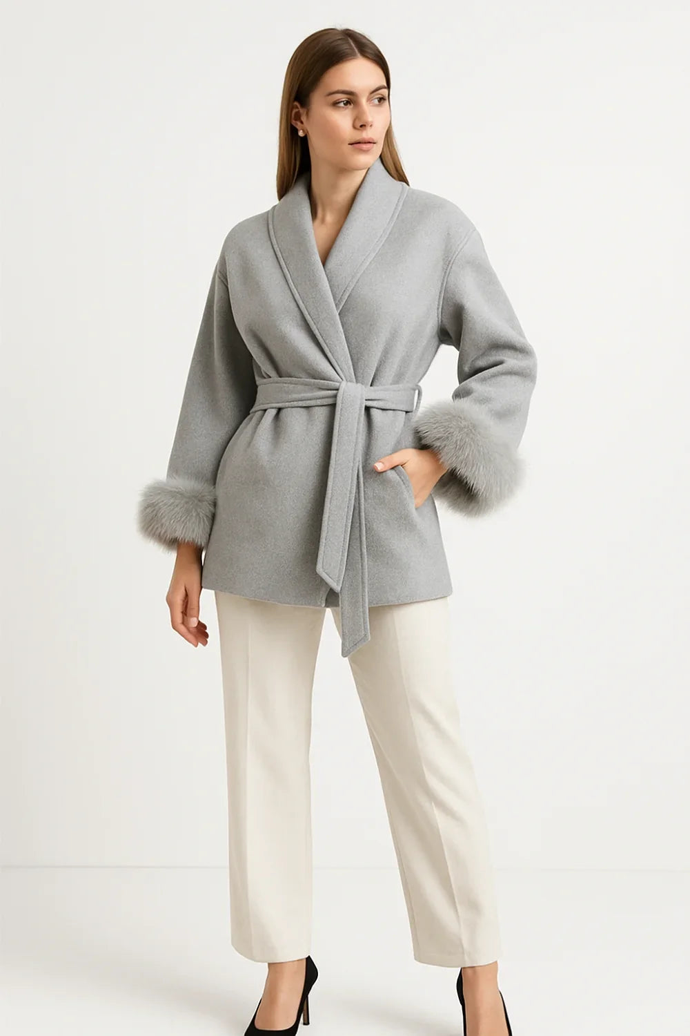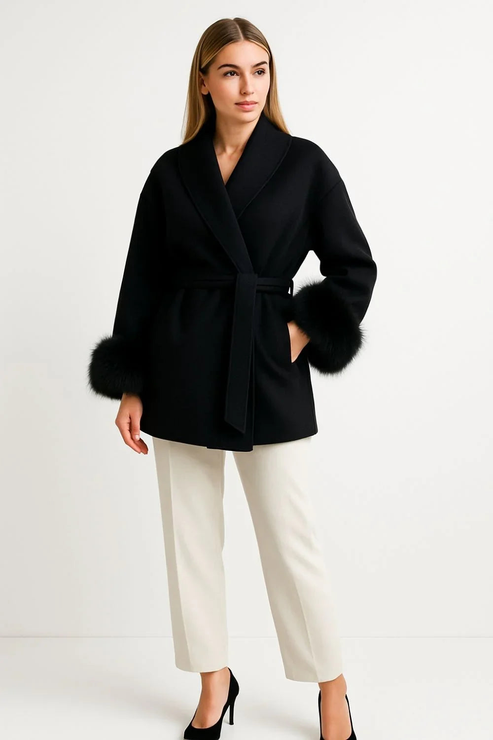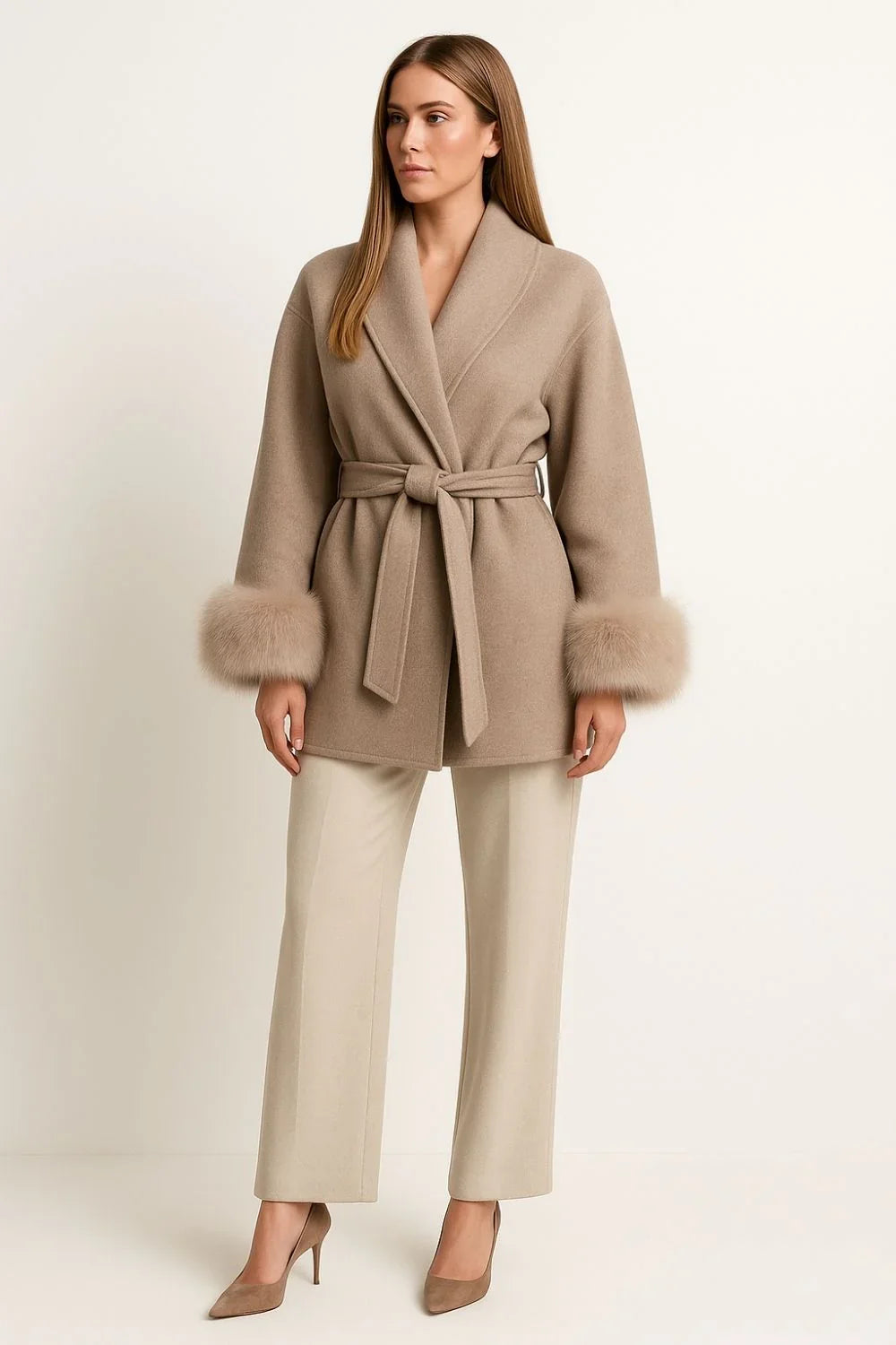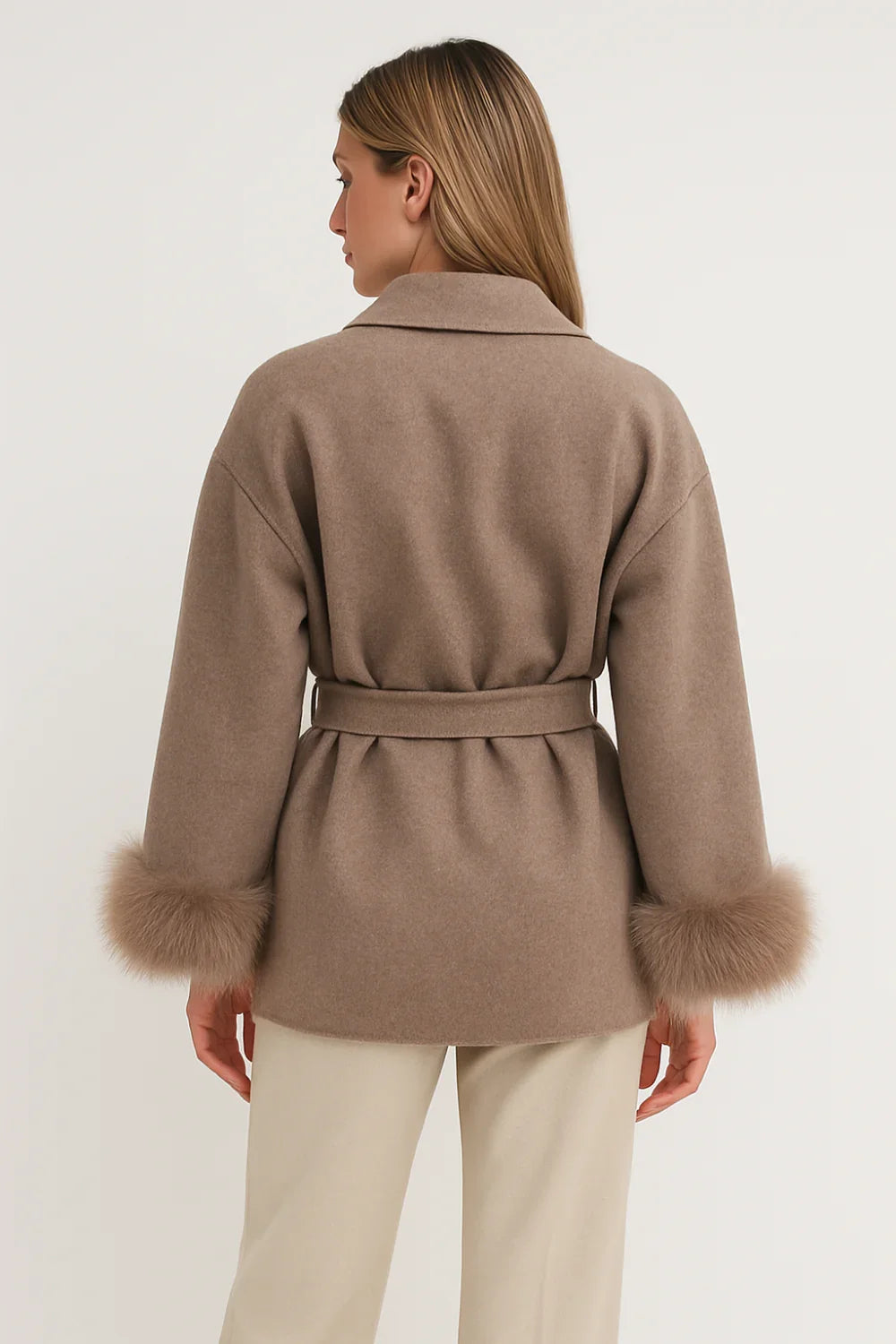 Ce manteau portefeuille luxueux est confectionné en mélange de laine et cachemire, orné de poignets en fausse fourrure douce. Sa coupe ajustée avec ceinture met en valeur la taille, tandis que sa longueur au niveau des hanches lui confère une allure moderne et élégante. Chaud et confortable, il est parfait pour les journées fraîches d’automne et d’hiver.
