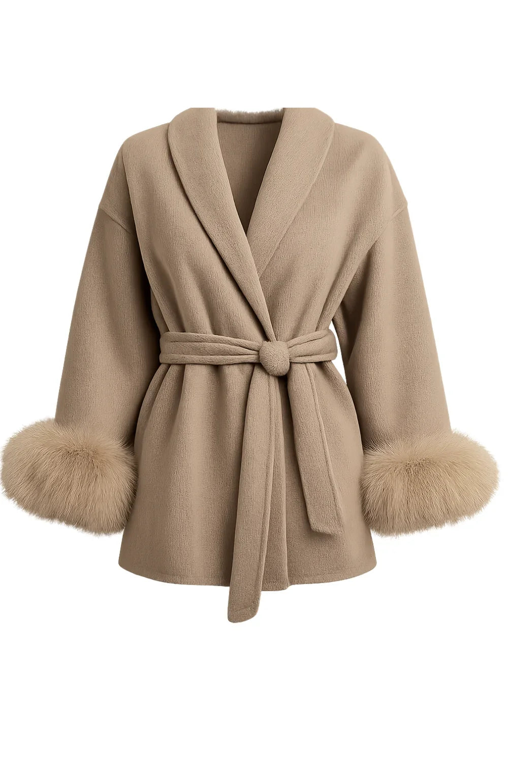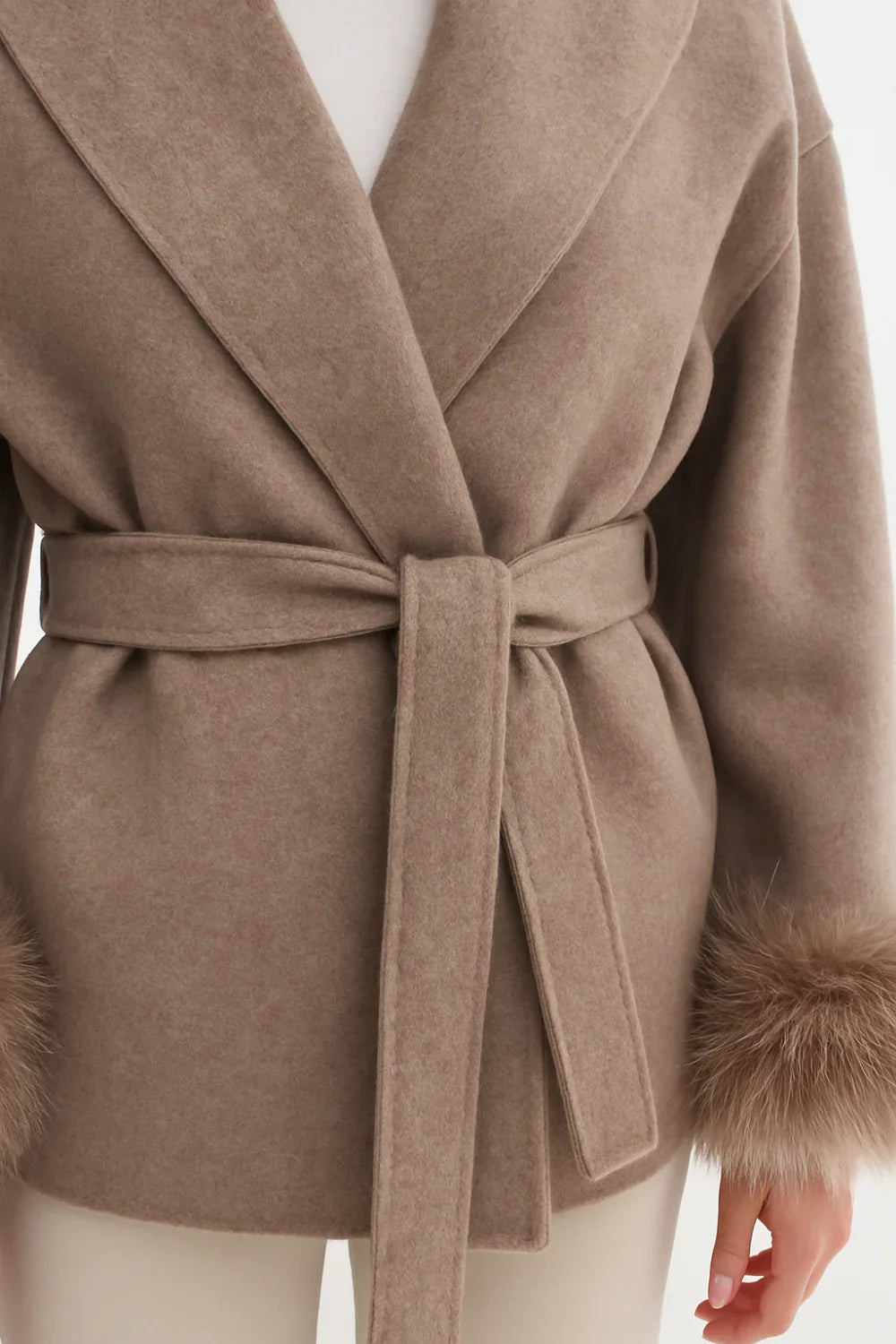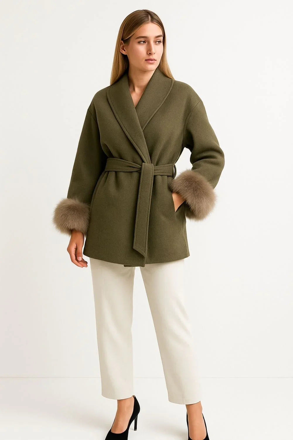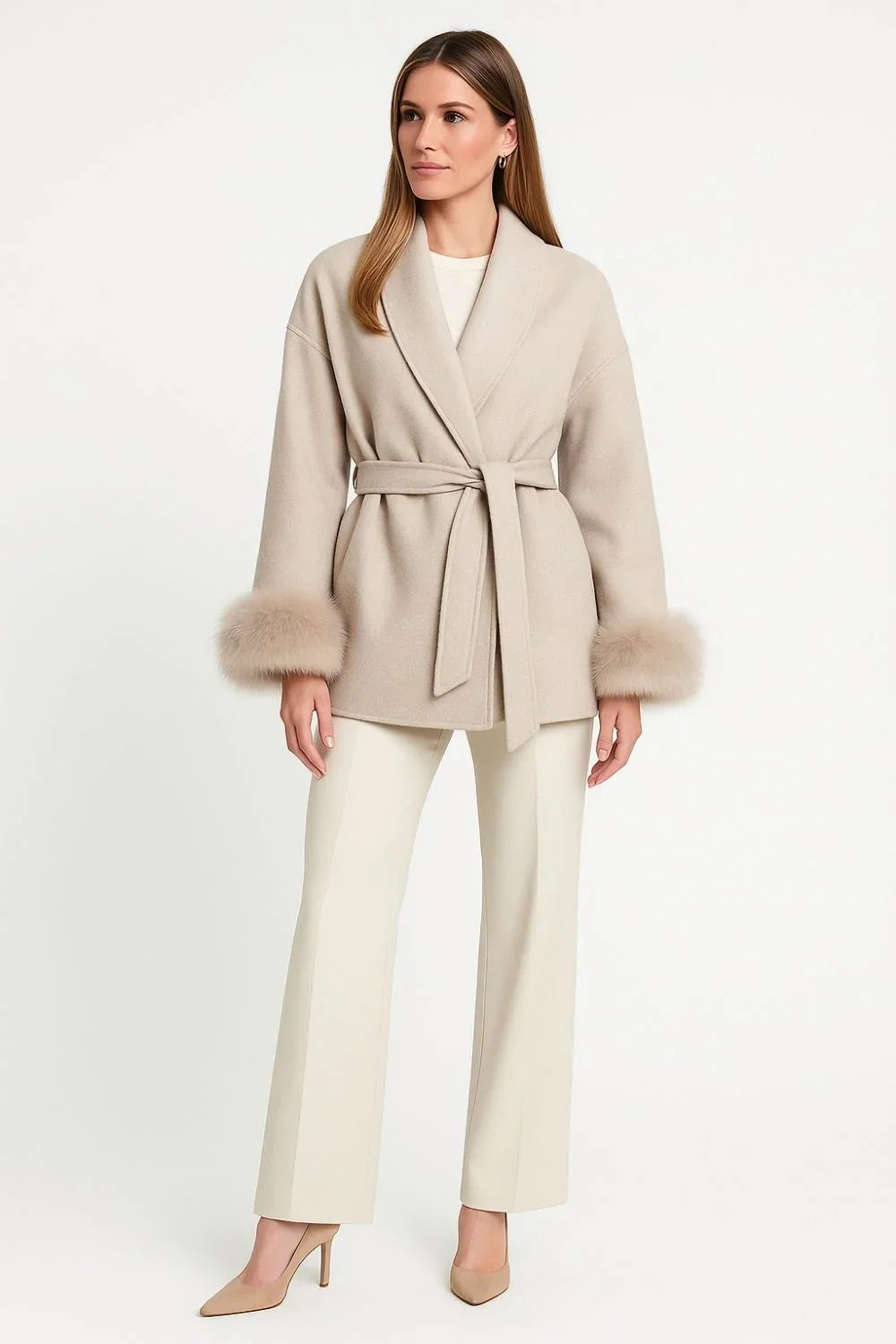 Ce manteau portefeuille luxueux est confectionné en mélange de laine et cachemire, orné de poignets en fausse fourrure douce. Sa coupe ajustée avec ceinture met en valeur la taille, tandis que sa longueur au niveau des hanches lui confère une allure moderne et élégante. Chaud et confortable, il est parfait pour les journées fraîches d’automne et d’hiver.