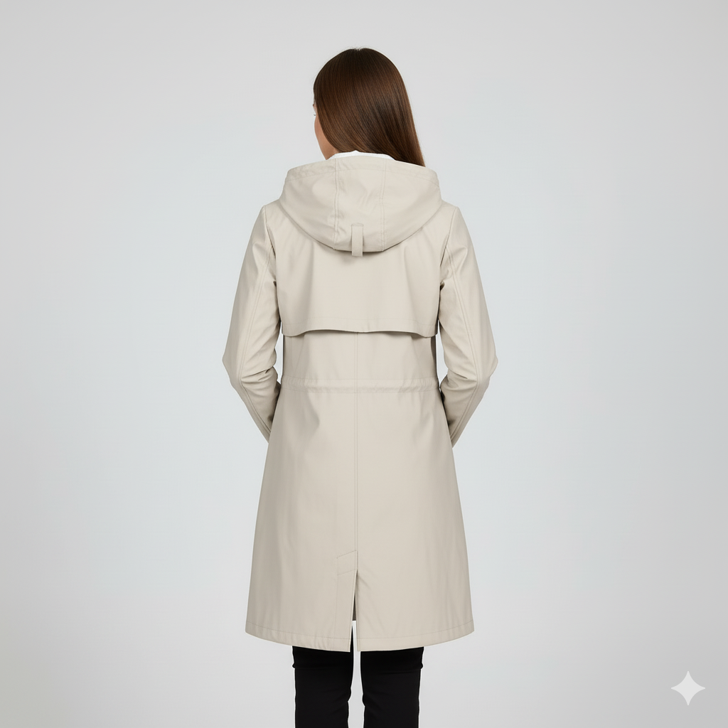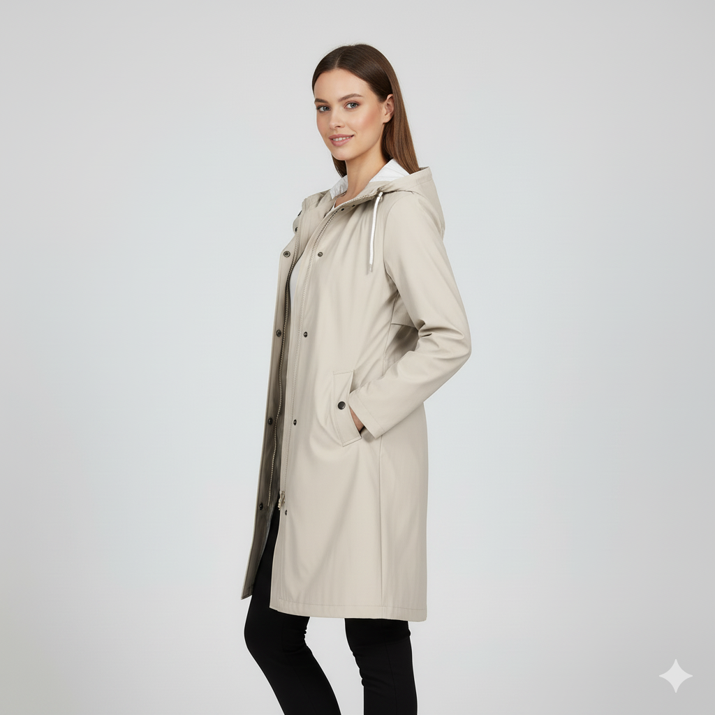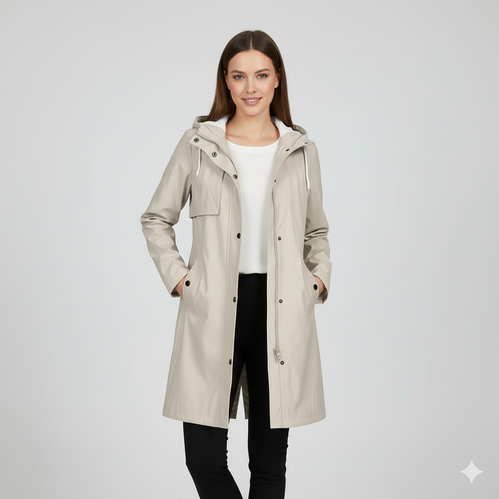 Un manteau pratique et élégant, pensé pour accompagner la femme moderne avec style, même sous la pluie.