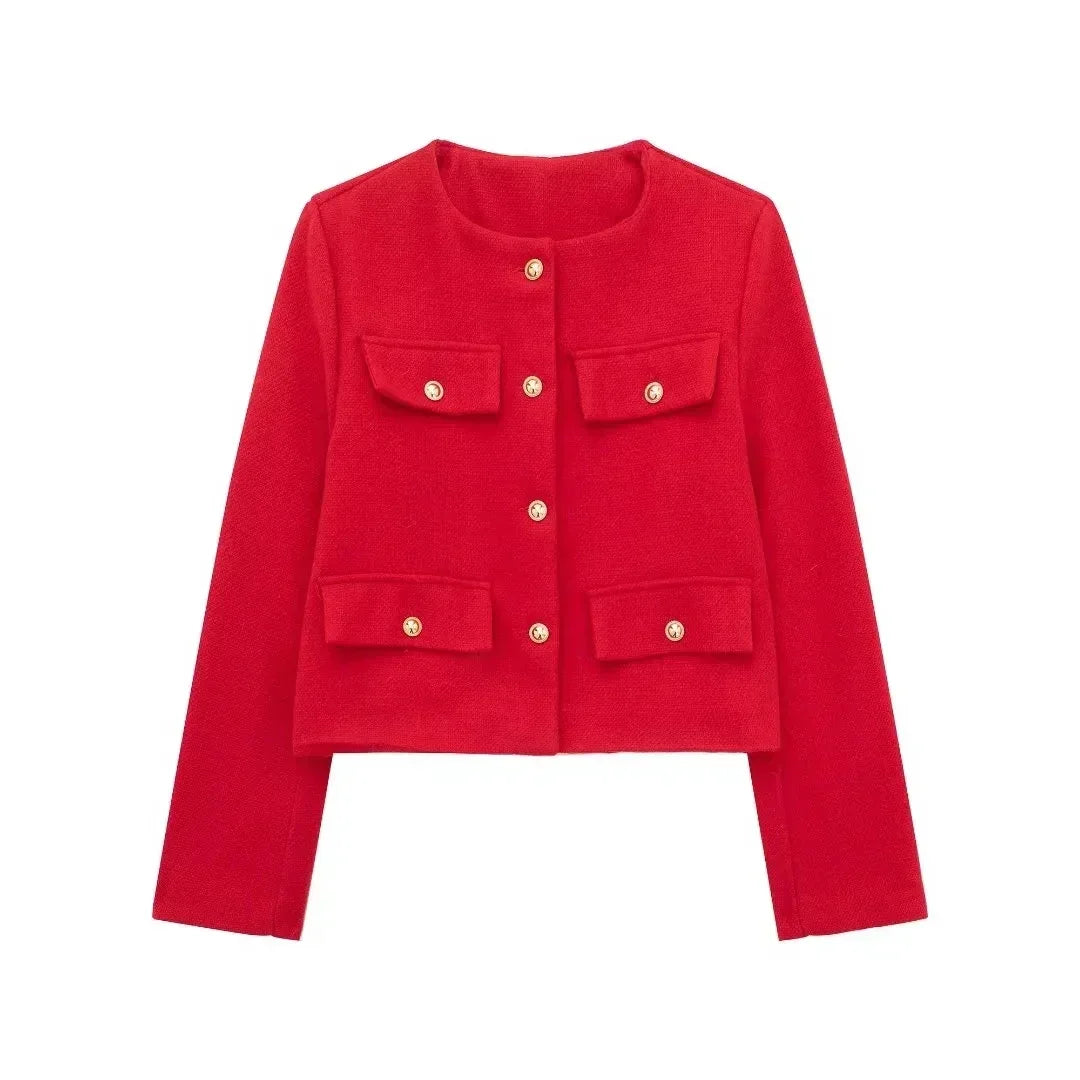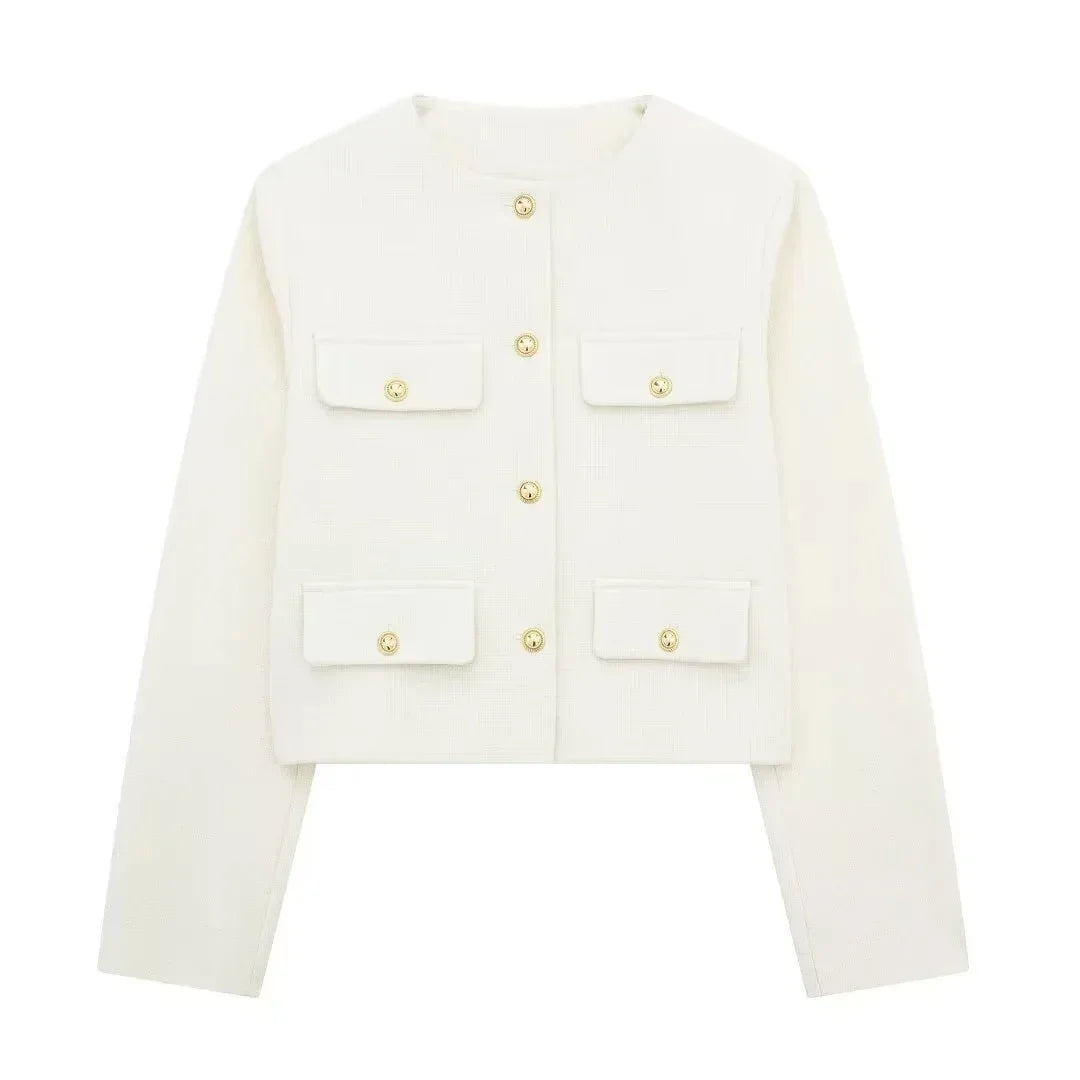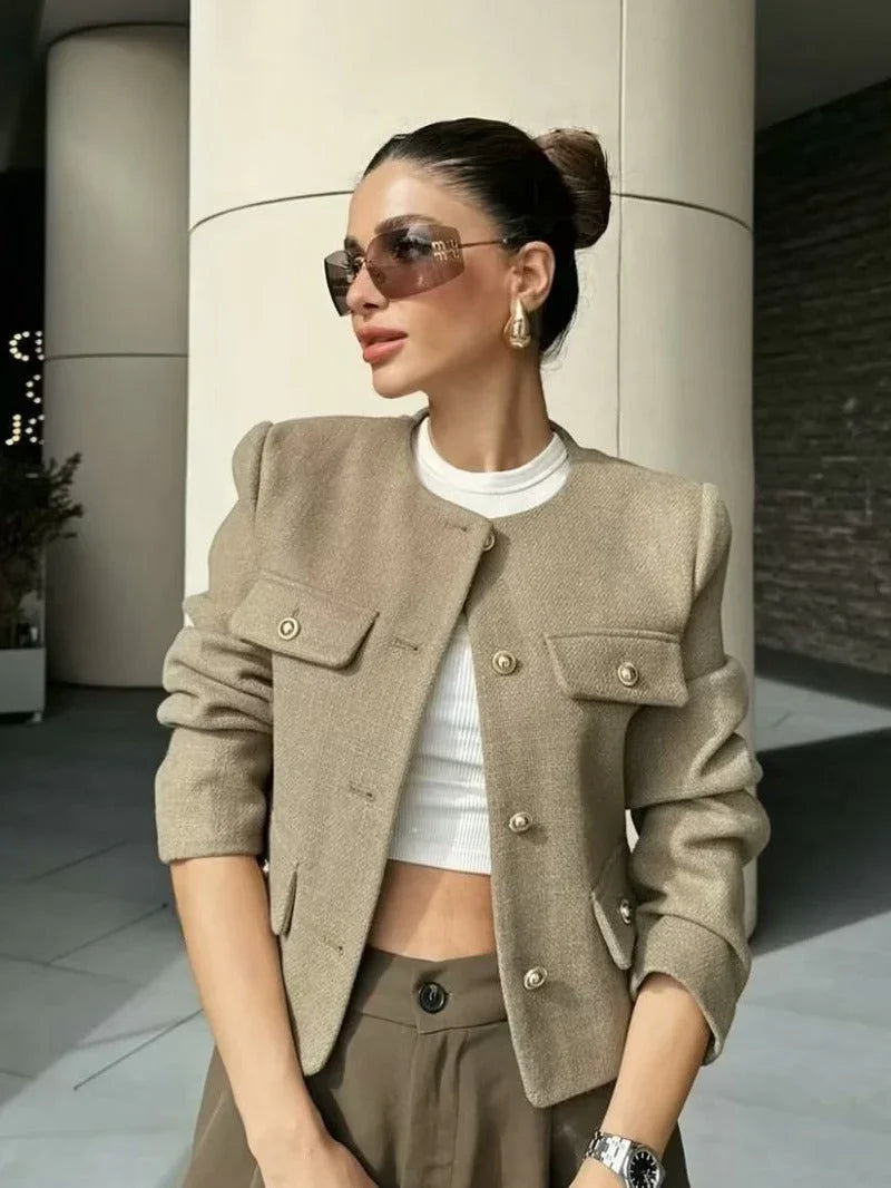 Entrez dans l'élégance intemporelle avec la Veste Vintage Courte Megan, une pièce maîtresse alliant charme classique et sophistication moderne. Cette veste rehausse sans effort n'importe quelle tenue, que ce soit pour une journée décontractée ou un événement en soirée.